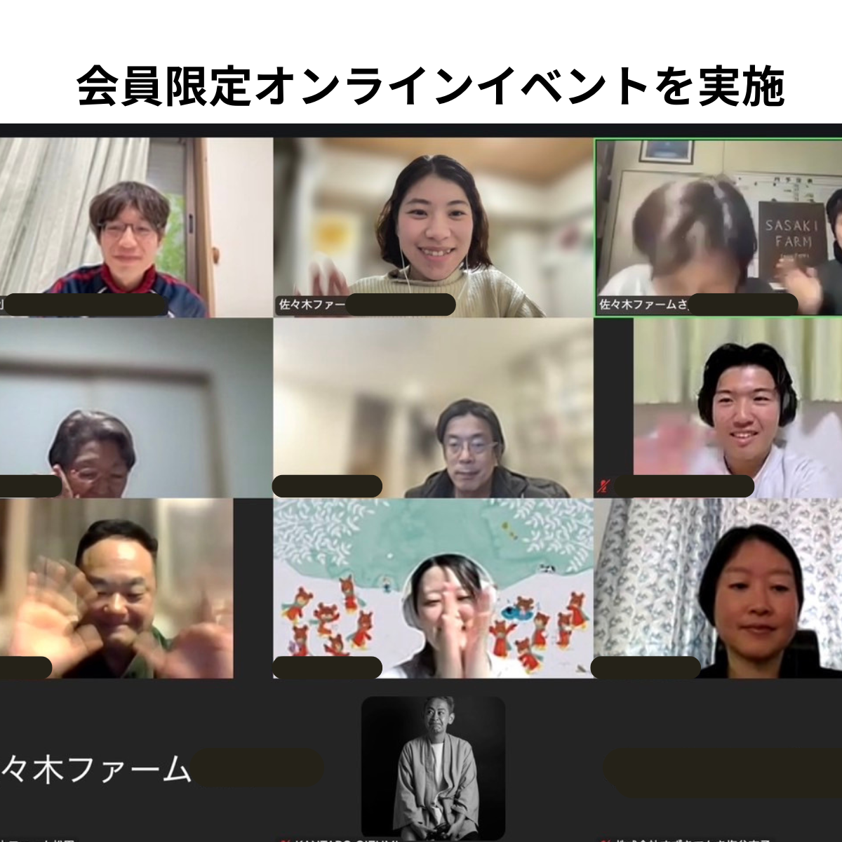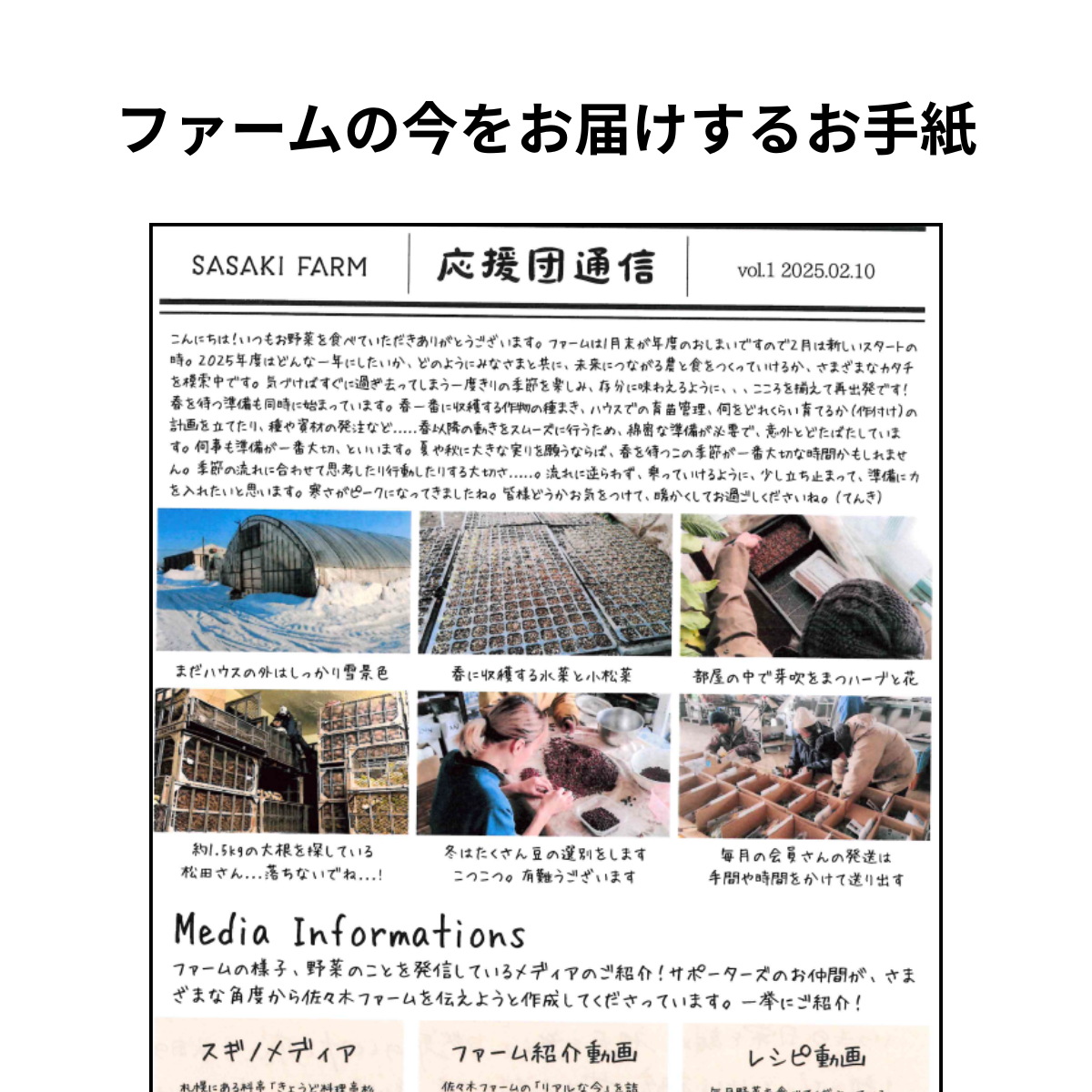 月に一度のお手紙、年に一度のお野菜セットのお届け、さらにオンライン・オフラインイベント、限定グループへのご招待などを通して、佐々木ファームと共に歩んでいただく“応援団”の仕組みです。